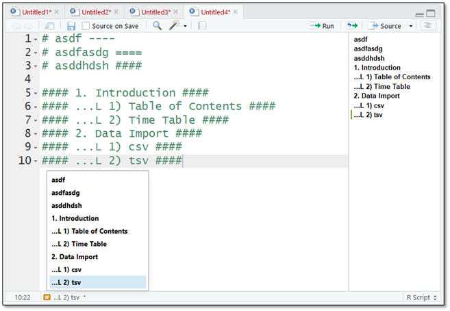 - this_is_name <- 2.5와 같은 명령어를 쳤을 때 사실 값이 3.5인 것을 잘못 입력했다고 하자 이럴때는 콘솔창에서 this만 입력하고 컨+ 화살표 위 를 입력하면 this와 매칭되는 이전에 입력한 명령어가 뜬다. (console에서만 가능)
