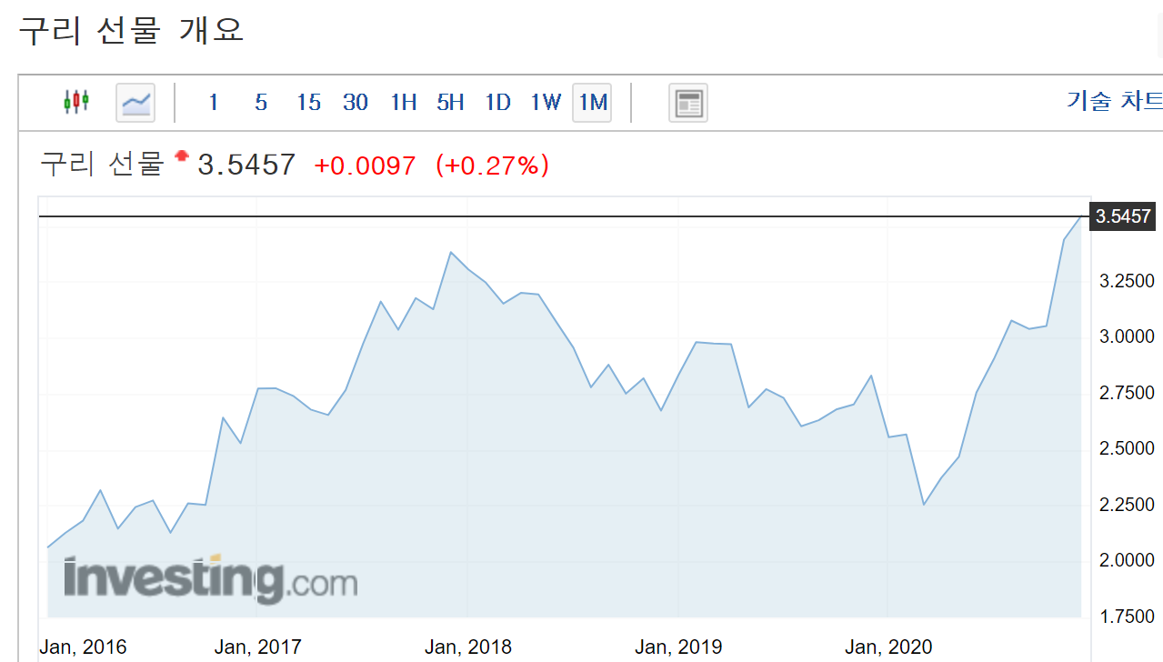 >> 원유에만 해당 되는 얘기가 될 수 있지만... 다른 원자재들도 향후 상당 기간 어려운 흐름이 이어질 수 있다.(구리 가격에 대해서 한 번 찾아봤는데... 책에서는 어려운 흐름이 이어질 수 있다고 했지만 아래 차트를 보면 코로나 이후 엄청나게 올랐다.)