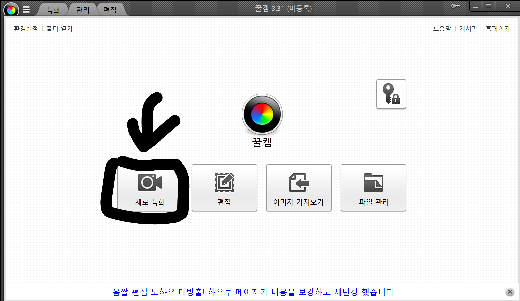 2. 꿀캠을 키고 새로 녹화를 누른다.